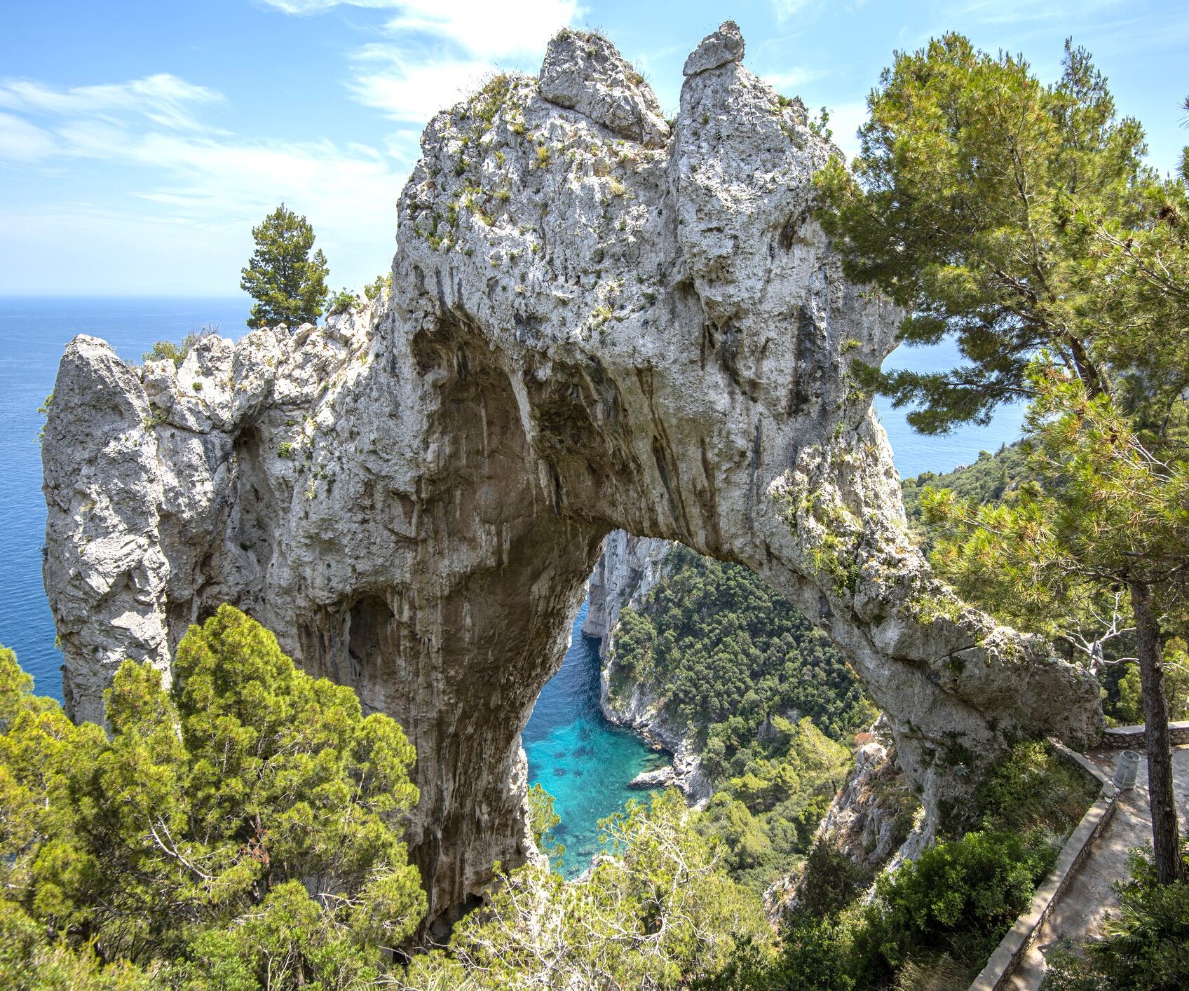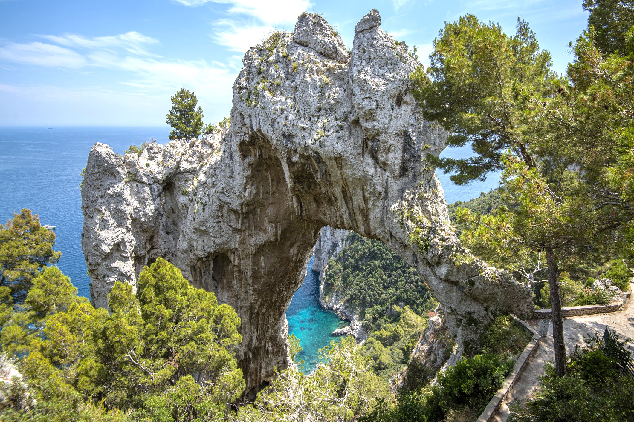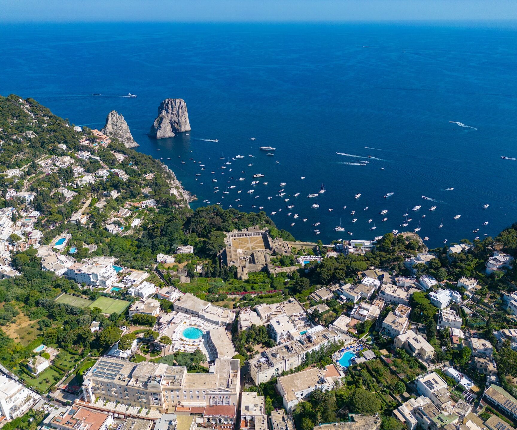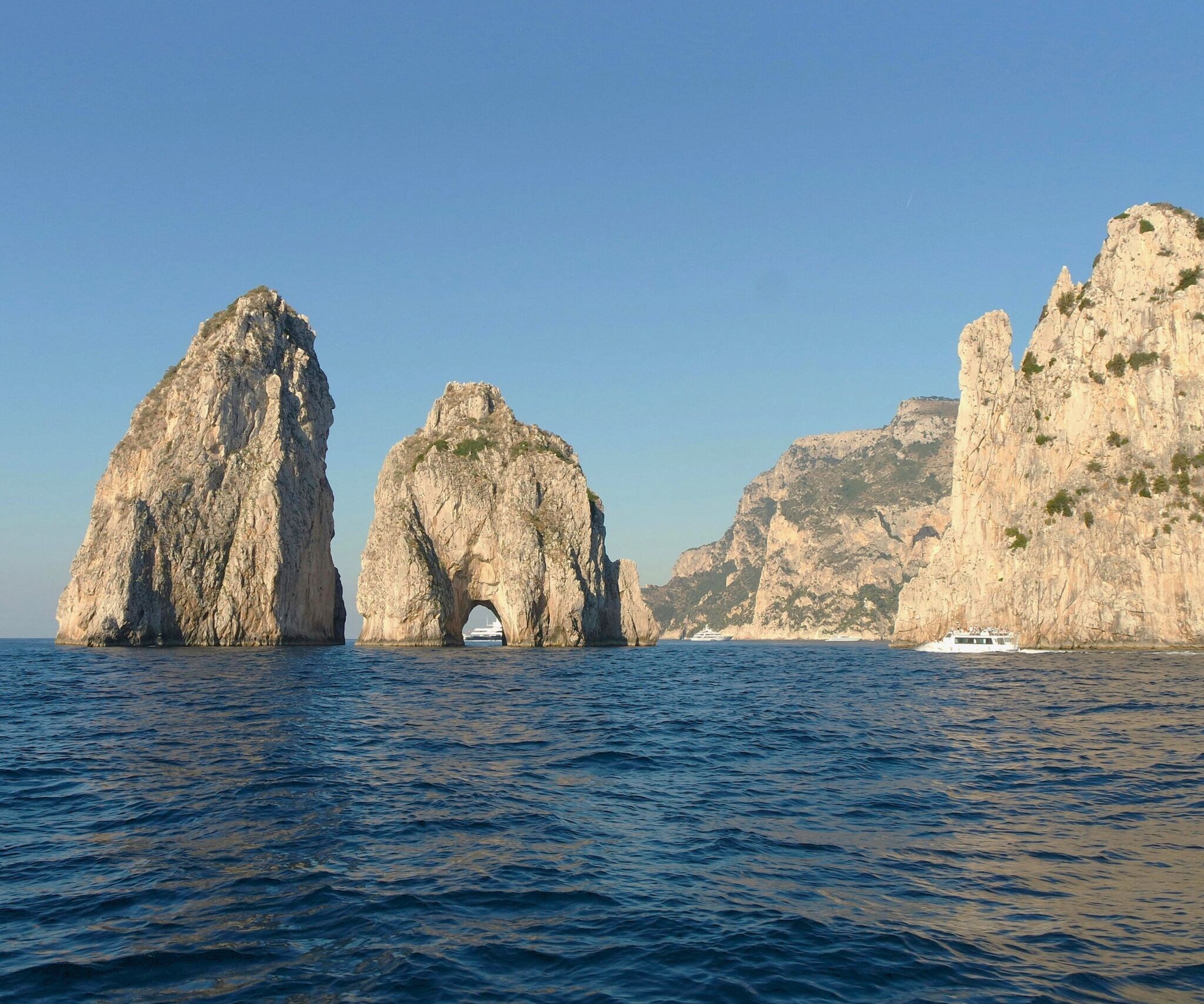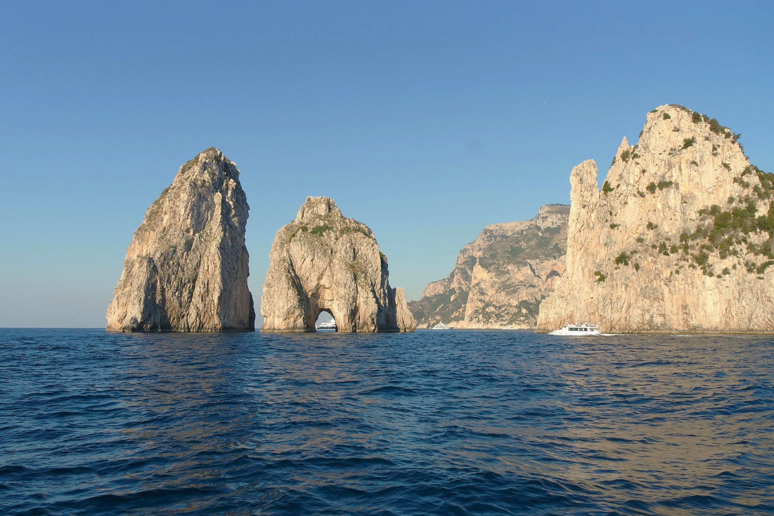 All’arrivo a Capri, inizieremo il tour intorno all’isola** per scoprirne tutte le meraviglie naturali: l’incantevole Grotta Bianca, dove le formazioni calcaree bianche creano un’atmosfera magica. Ammireremo poi l’imponente Arco Naturale, una roccia che sovrasta il mare, e ci dirigeremo verso i leggendari Faraglioni, maestosi scogli che emergono dalle acque.