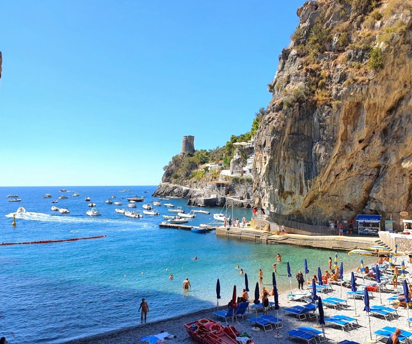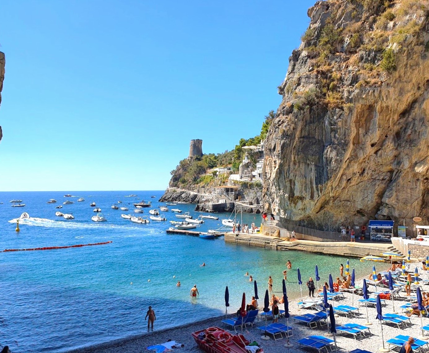 Il punto d’incontro è presso il nostro stand blu e bianco chiamato Positano Boats, sulla spiaggia principale di Positano conosciuta come “La Spiaggia Grande”