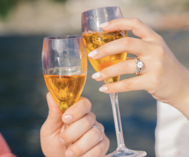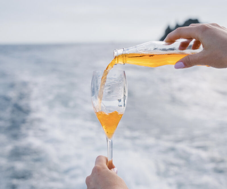 Con il sole che tramonta gradualmente, goditi un bicchiere di prosecco e qualche snack a bordo.