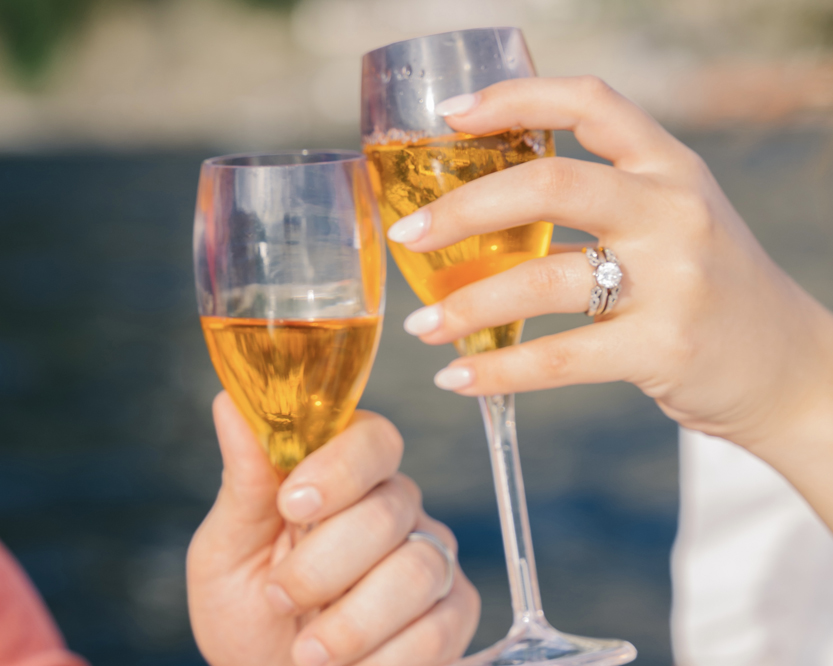 Con il sole che tramonta gradualmente, goditi un bicchiere di prosecco e qualche snack a bordo.