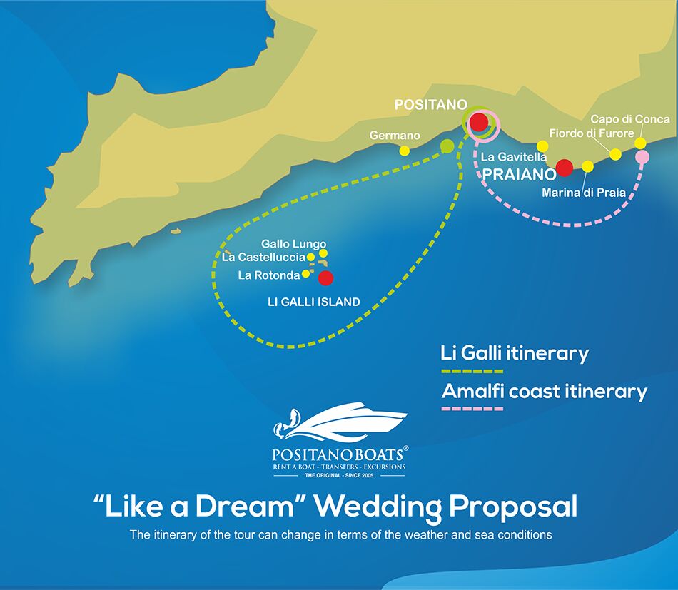 You’ll sail along the Amalfi Coast, from Positano* to Praiano and the stunning Fjord of Furore until Conca dei Marini, or around the enchanting Li Galli Islands, an archipelago of three little islets – Gallo Lungo, la Rotonda, and Castelluccia – and you will pass towards the Germano Rocks, a rocky formation that majestically emerges from the sea and detaches itself from the coastline. Its peculiarity is that when seen from the side, it resembles a face. It will be suggestive to pass through this passage with the boat.