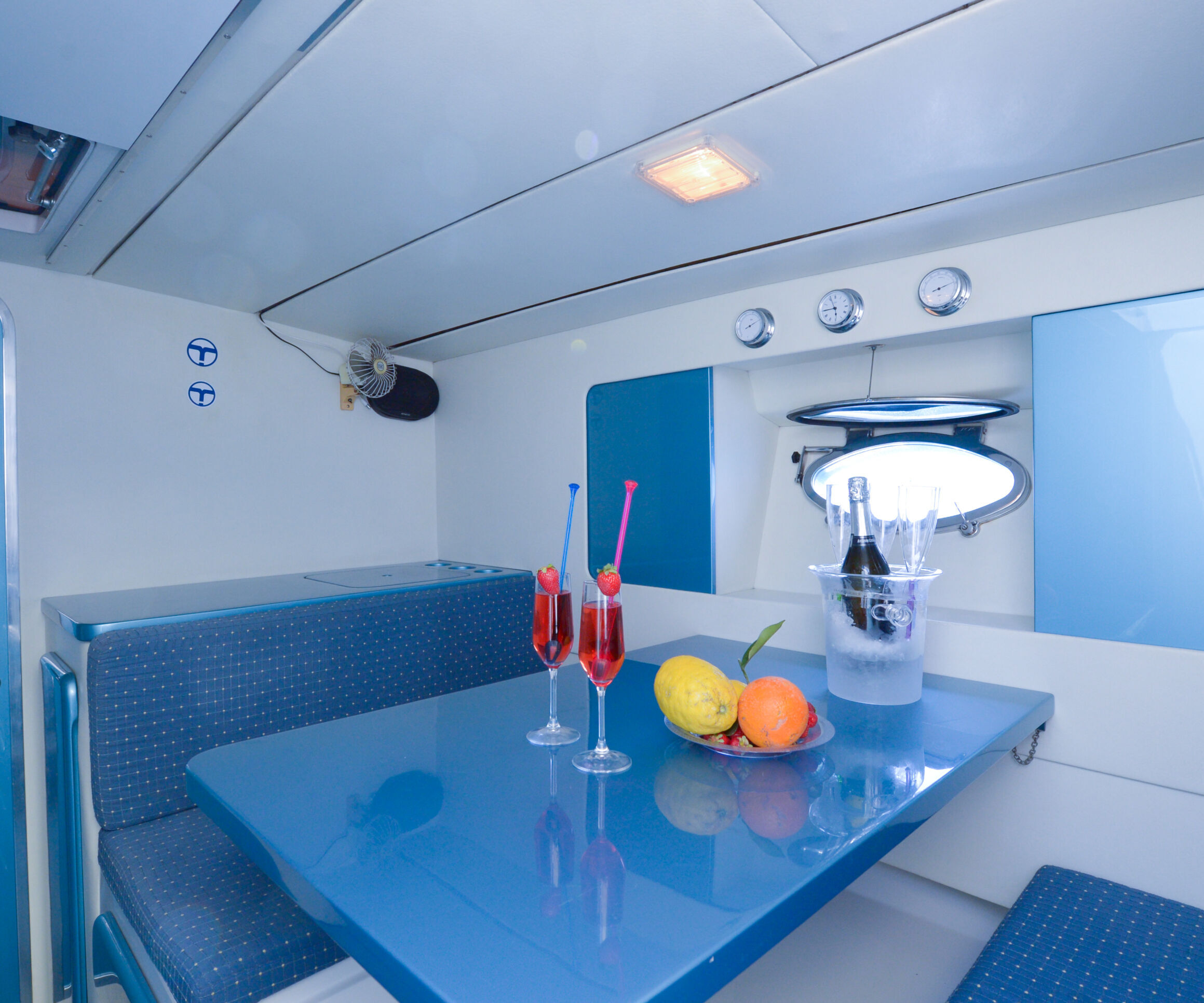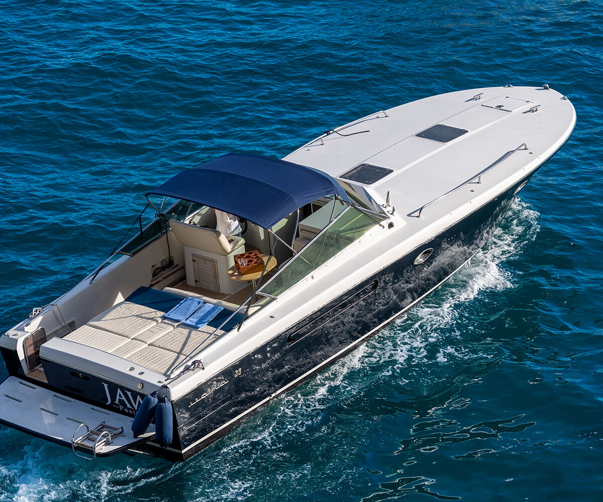 The “Jaw S”, is provided of a private cabin with bed and bathroom, a padded front to enjoy the sun and couches on the back with lunch table, shower and ladded.